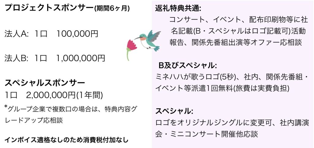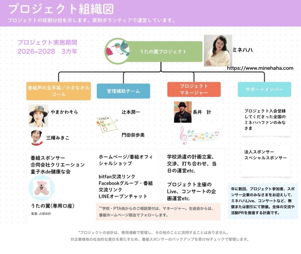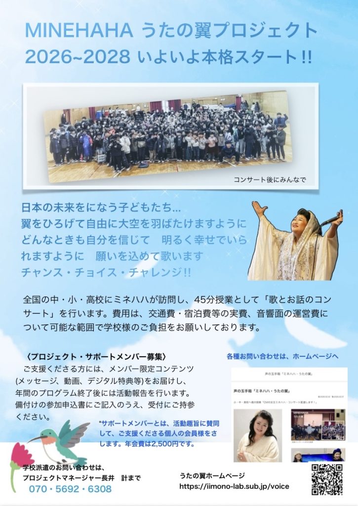 うたの翼プロジェクトは、単なる募金や寄付の受付ではなく、ミネハハファン、プロジェクトに賛同する方々をサポートメンバーとしてお迎えしたいと考えます。より広く、遠くへ訴えかける前に、土台をしっかりと固めるためです。