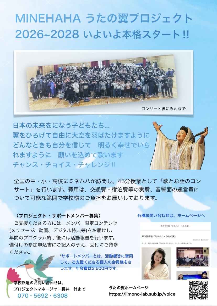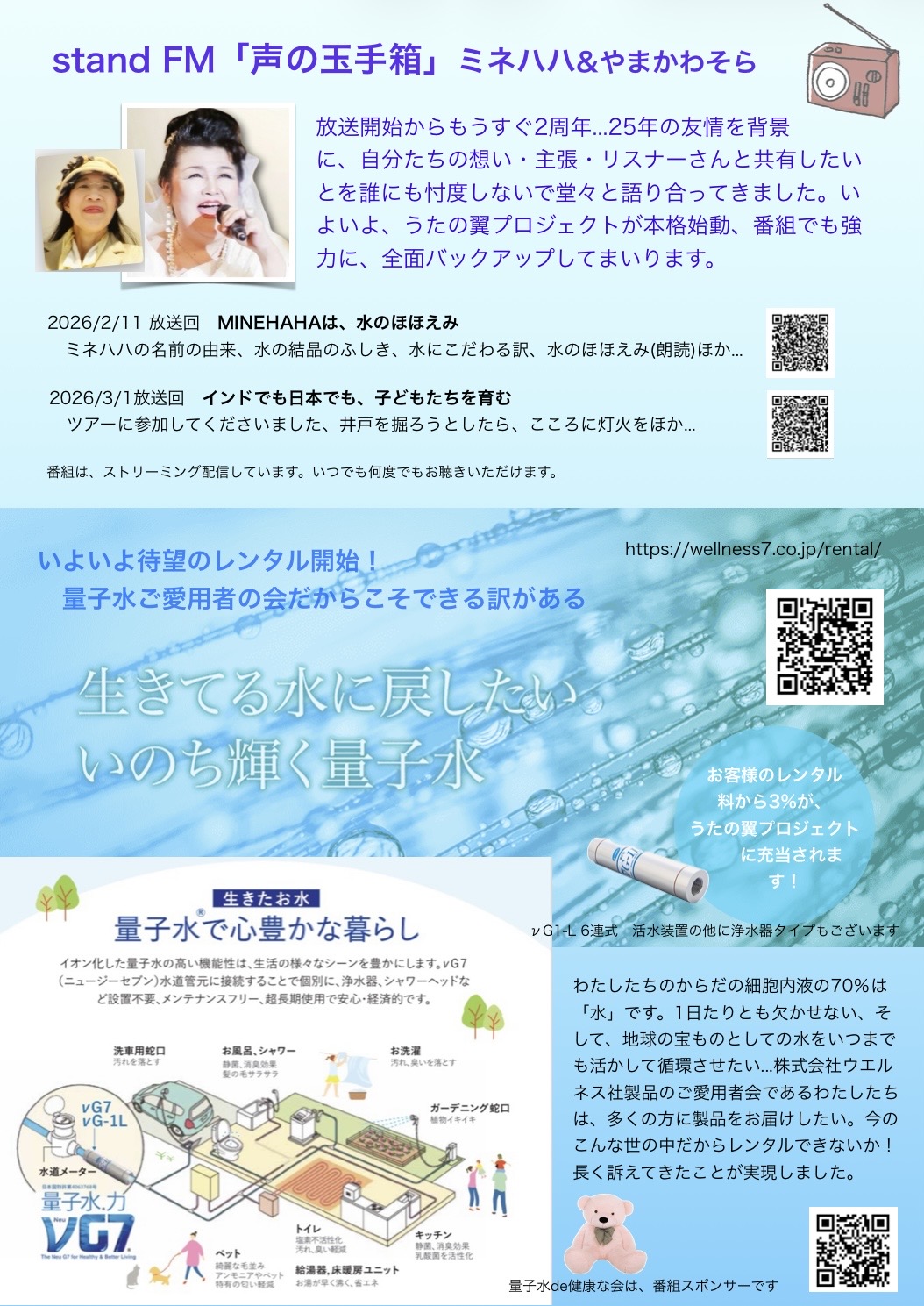 声の玉手箱は、メインパーソナリティ、ミネハハ&パーソナリティ、やまかわそらのコンビで、2024年4月から、月1・2回のペースで配信してまいりました。2026年はじめの放送では、うたの翼プロジェクトへの抱負を熱く語っています。ぜひ、一度お聴きください。